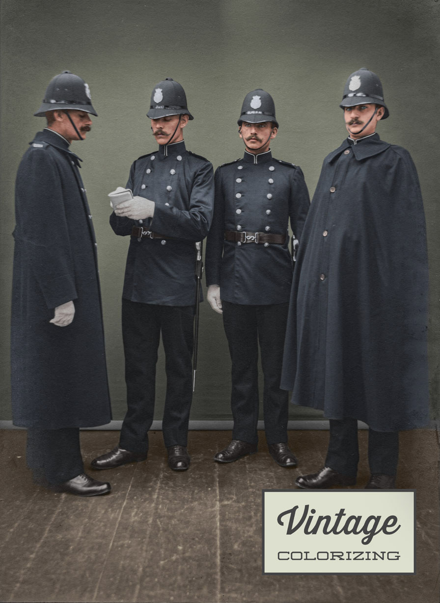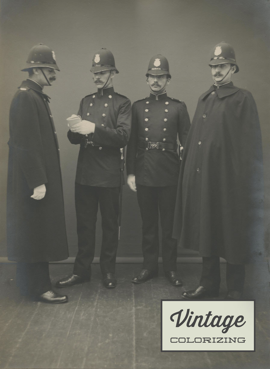 1912: vier agenten tonen het nieuwste politie uniform. Helm, knopen en een snor.