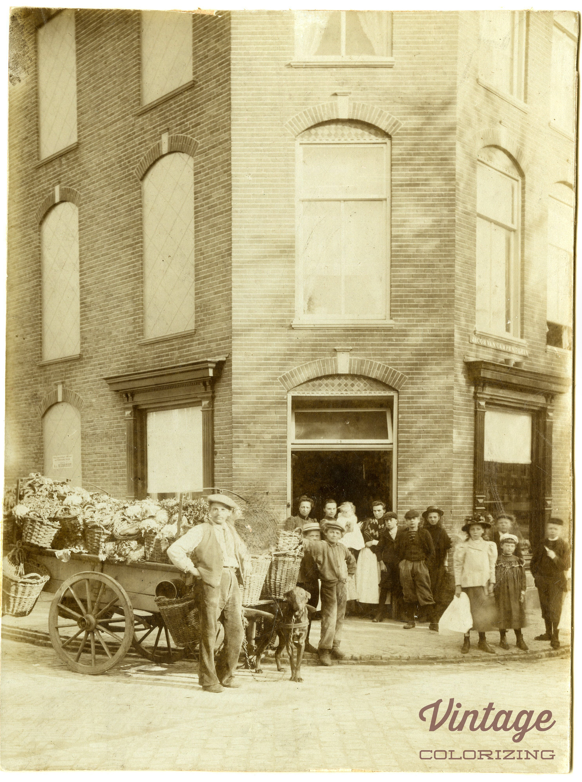 Ca. 1900: Groenteboer Van der Sar met hondenkar op de hoek van de Jan Steenstraat en Jacob van Campenplein te Den Haag.