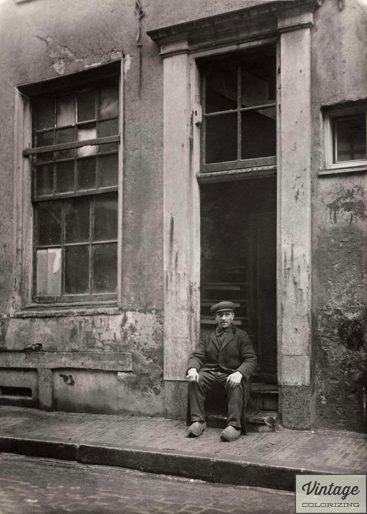 Een 72-jarige man op klompen op de trap voor zijn zeer bouwvallige huis in de Jodenbuurt in 1916.