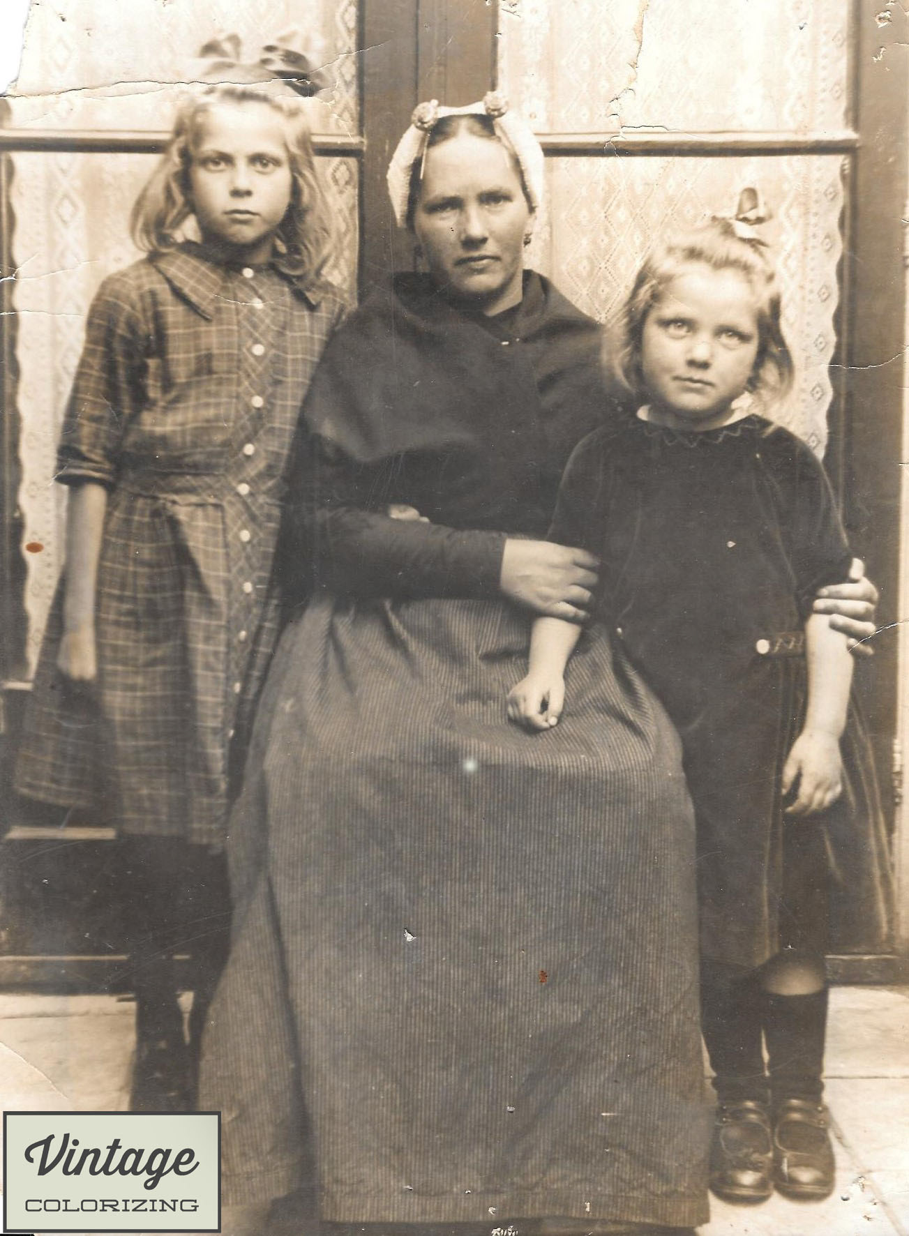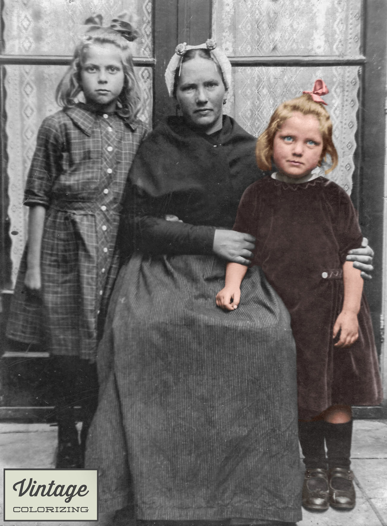 1925: Een moeder in Scheveningse klederdracht met haar twee dochters. Zie onderaan de 5 stadia van inkleuren.