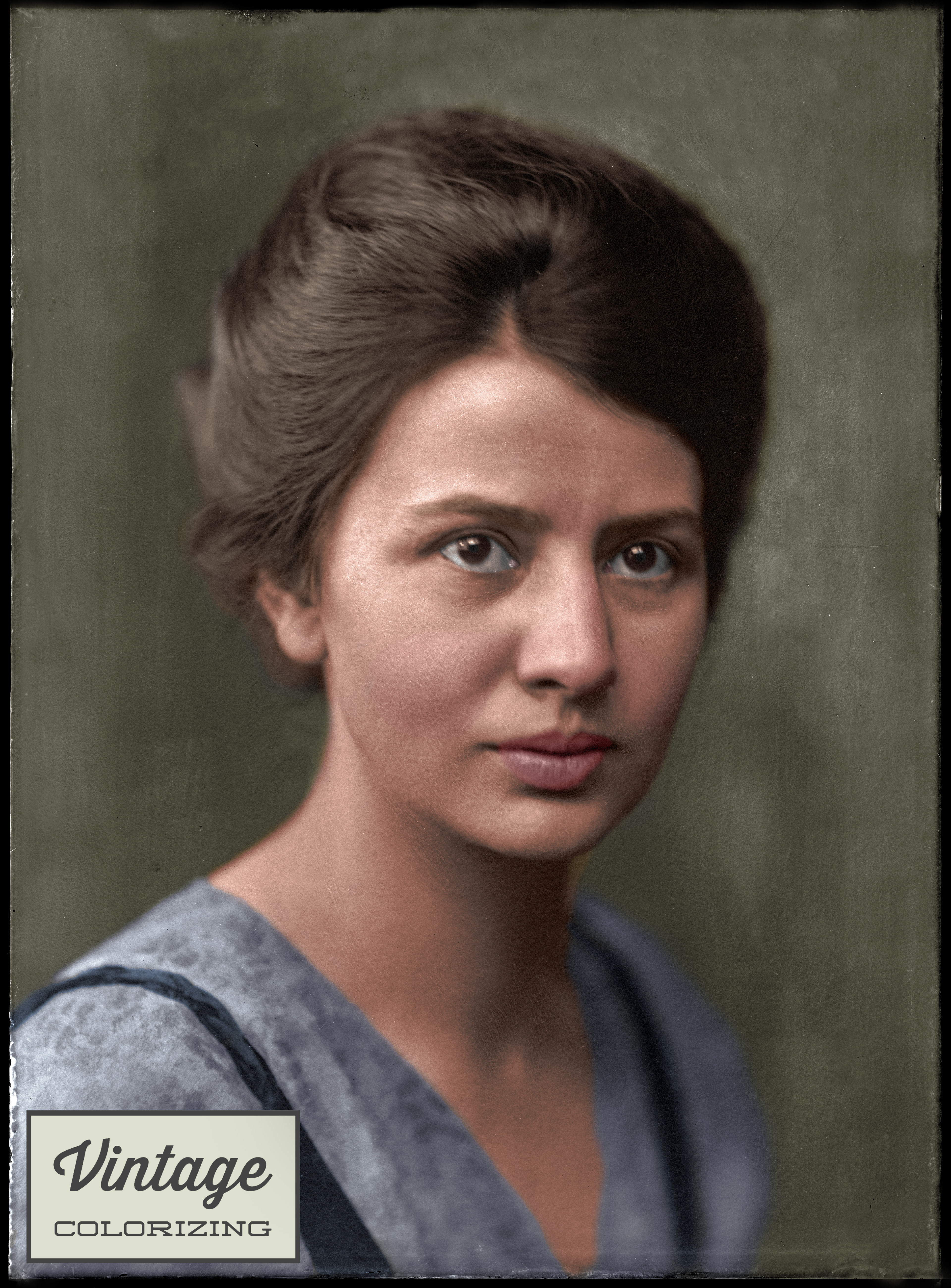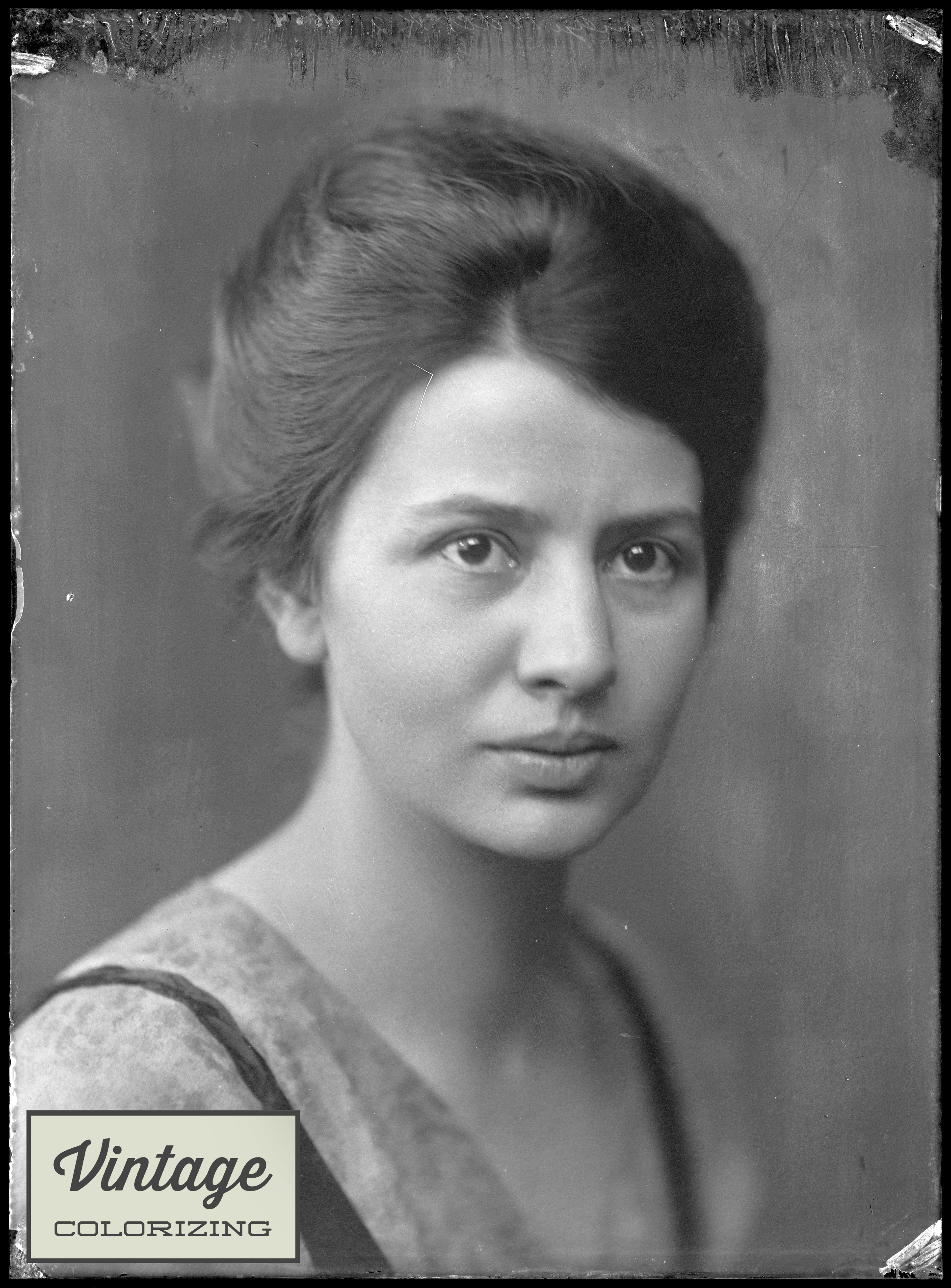 Portret van een dame uit de collectie J. Merkelbach. De foto is ingekleurd en de grootste beschadigingen zijn hersteld.