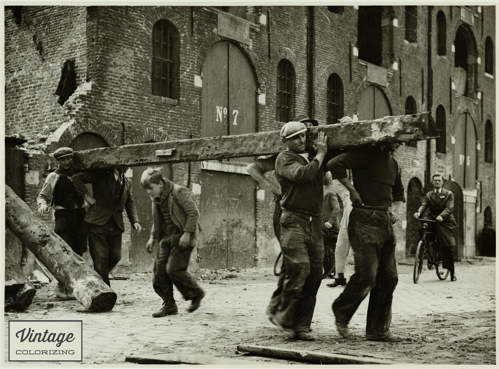 Begin 20ste eeuw: Werklui zijn bezig met het slopen van een pand en tillen de steunbalken bij de Prinsengracht 225-229 weg. Op de achtergrond zijn pakhuizen nummers 5-7 zichtbaar.