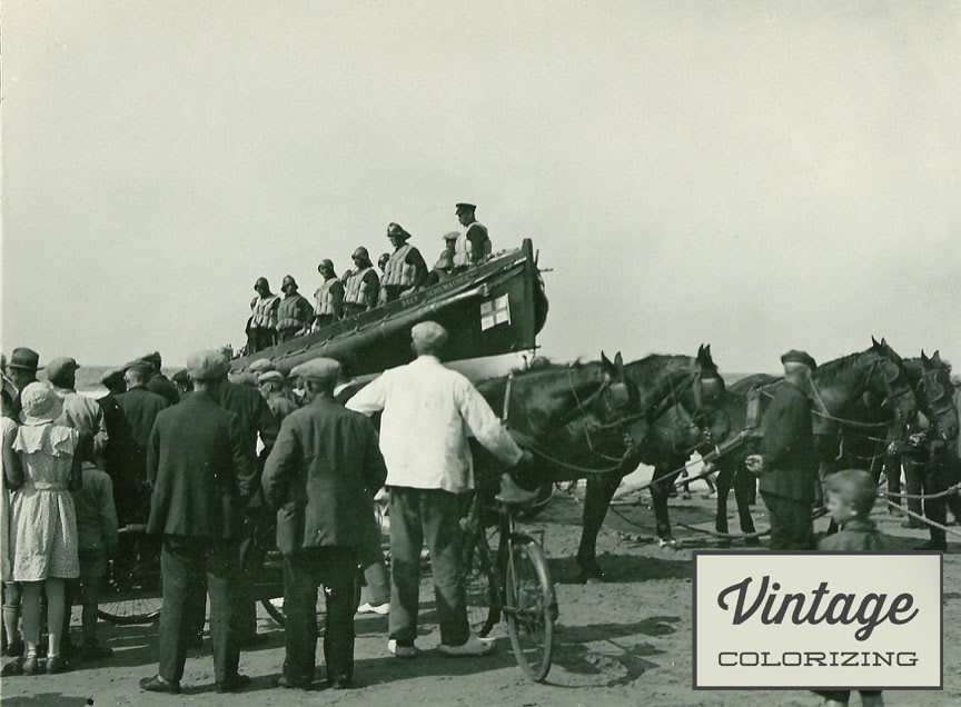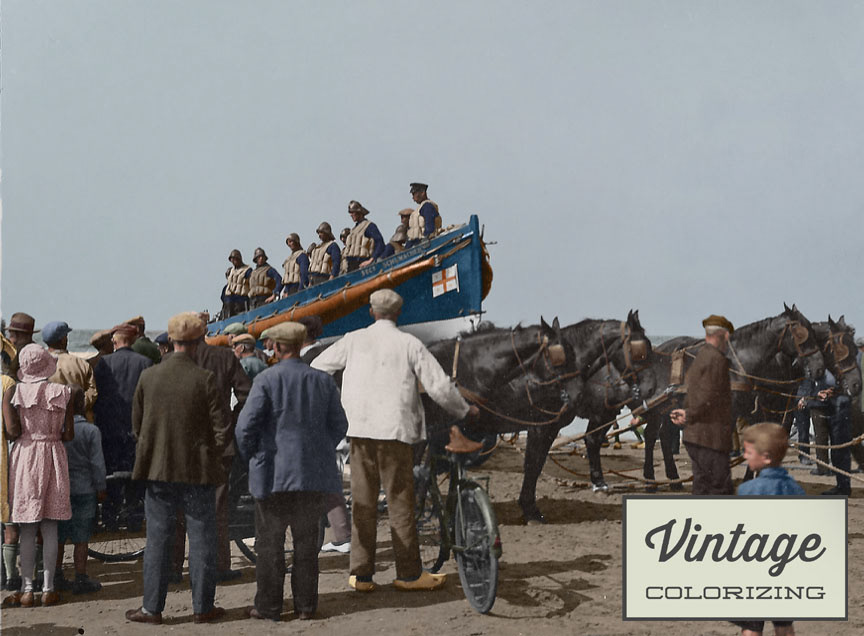 Jaren '30: De reddingsboot aan het strand van Ter Heijde aan zee is na onderzoek in de authentieke kleuren ingekleurd.