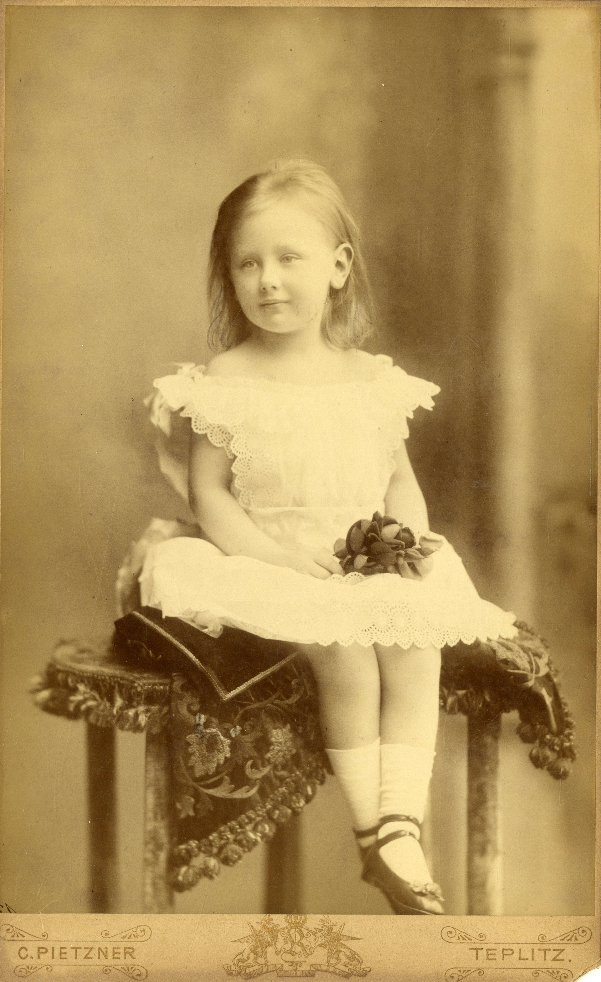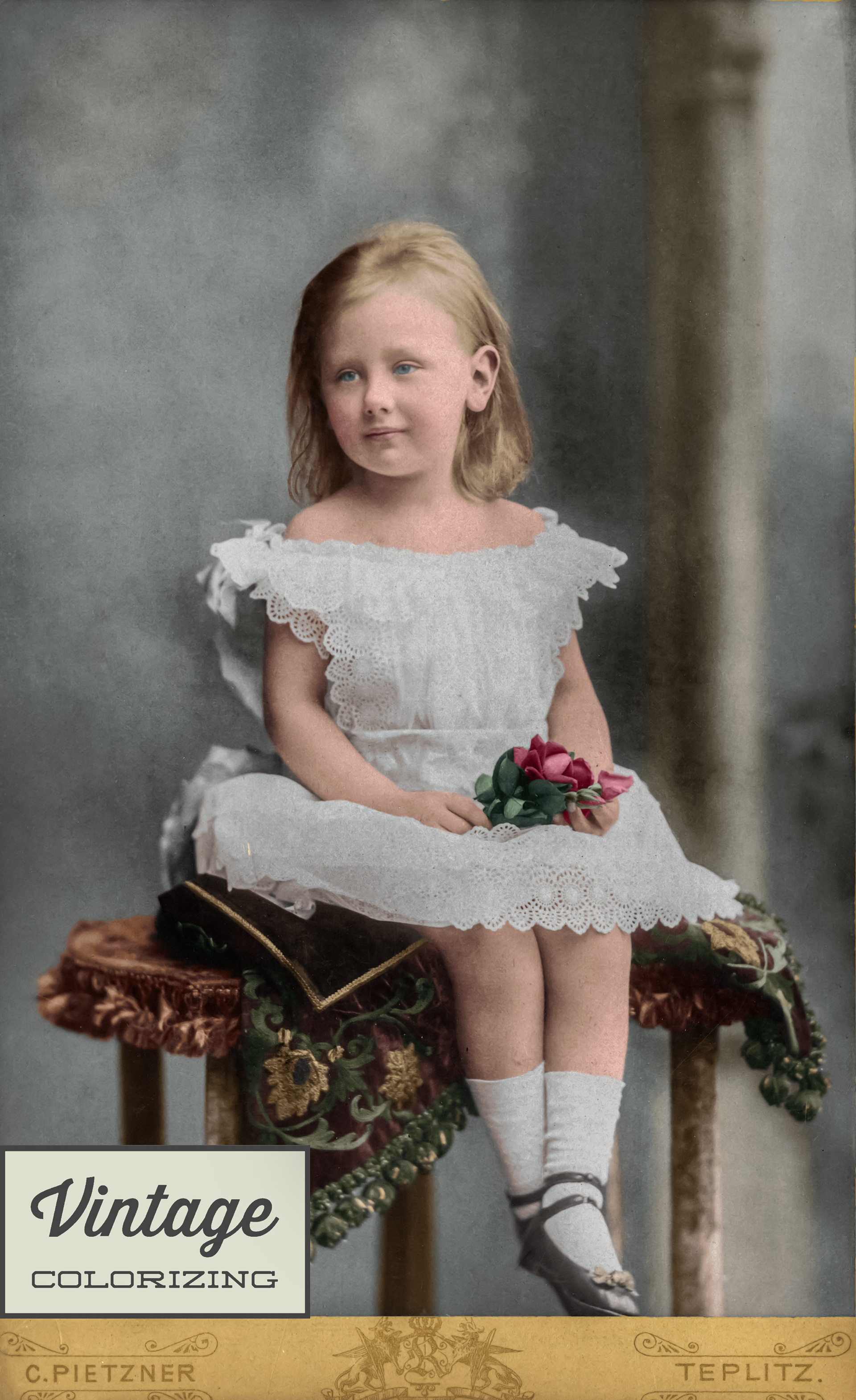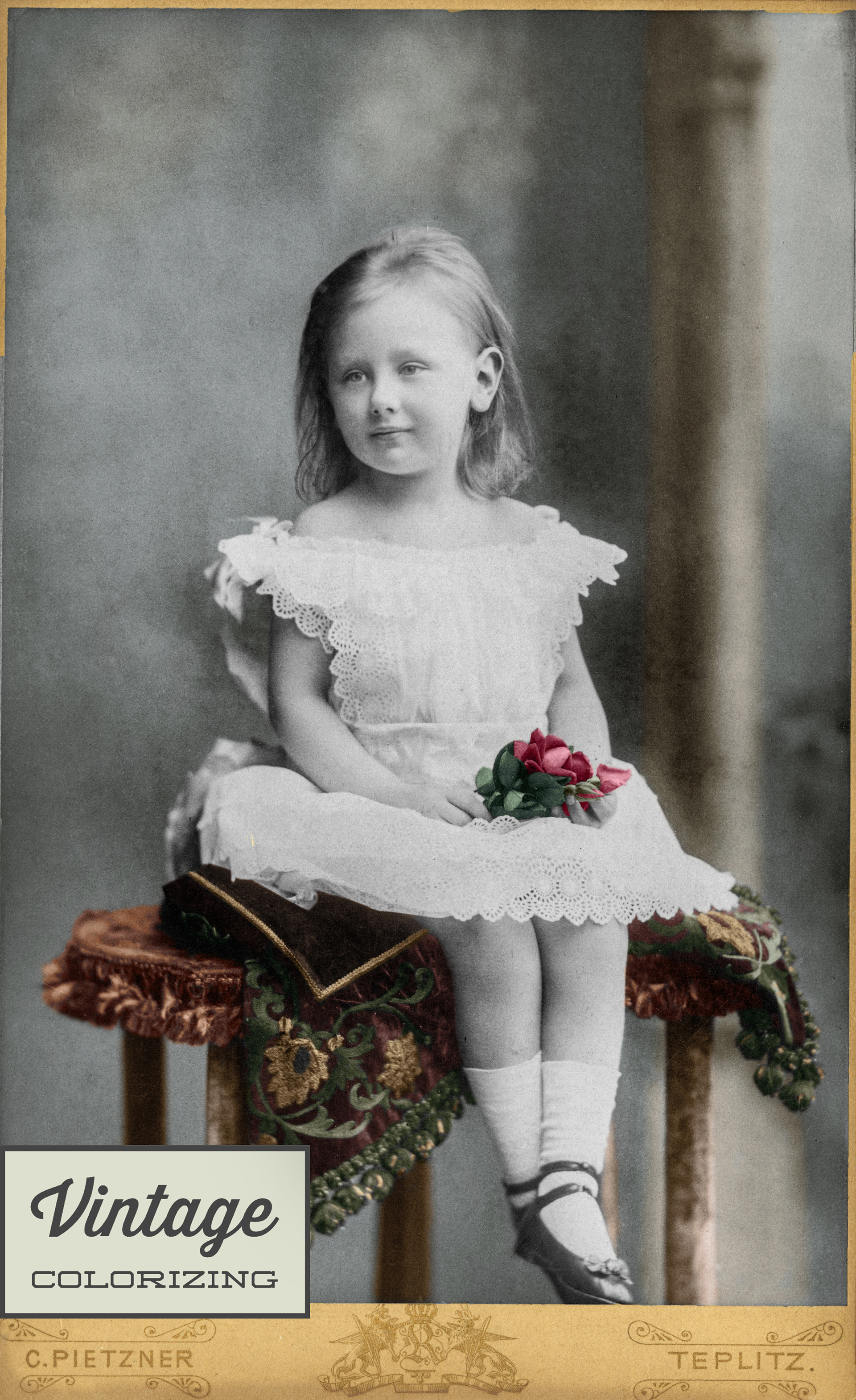 Ingekleurd en hersteld: Een foto uit 1885 van een 5-jarige Koningin Wilhelmina in Teplitz-Schönau waar haar moeder op dat moment een kuur deed. Onderaan is het inkleuren in 4 stadia te zien.